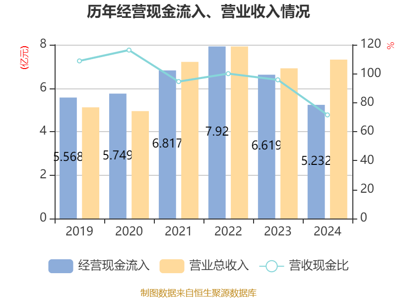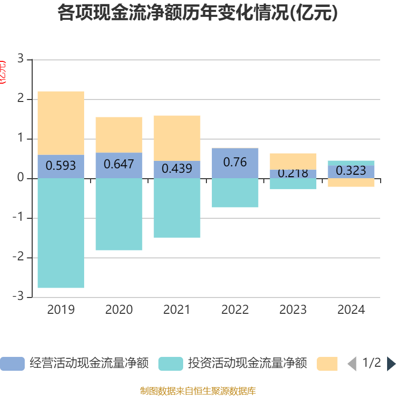 截至2024年,公司经营活动现金流净额为3233.16万元,同比增长48.39%;筹资活动现金流净额-2158.96万元,同比减少6234.17万元;投资活动现金流净额1188.16万元,上年同期为-2759.06万元。