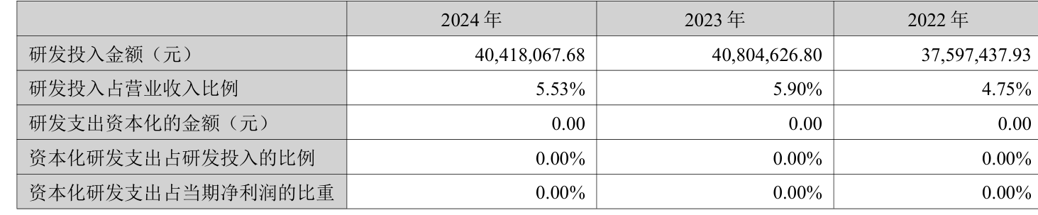 2024年全年,公司研发投入金额为4041.81万元,同比下降0.95%;研发投入占营业收入比例为5.53%,相比上年同期下降0.37个百分点。此外,公司全年研发投入资本化率为0%。