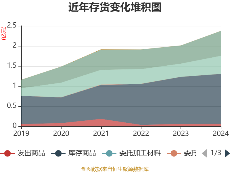 从存货变动来看,截至2024年末,公司存货账面价值为2.37亿元,占净资产的34.79%,较上年末增加3621.41万元。其中,存货跌价准备为2173.53万元,计提比例为8.4%。