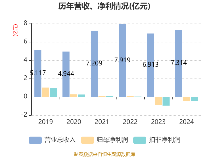 中证智能财讯扬帆新材(300637)4月25日披露2024年年度报告。2024年,公司实现营业总收入7.31亿元,同比增长5.80%;归母净利润亏损4604.27万元,上年同期亏损8773.2万元;扣非净利润亏损4842.97万元,上年同期亏损9637.02万元;经营活动产生的现金流量净额为3233.16万元,同比增长48.39%;报告期内,扬帆新材基本每股收益为-0.1961元,加权平均净资产收益率为-6.75%。