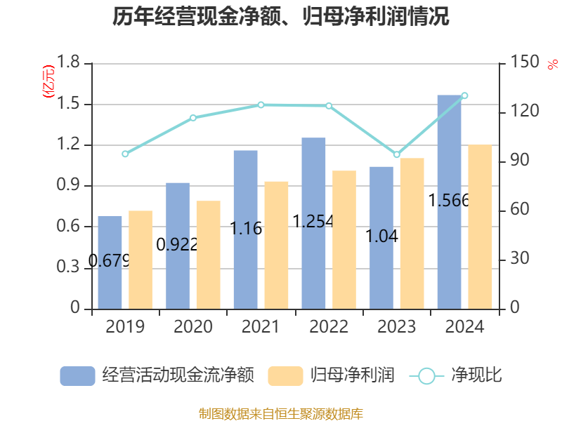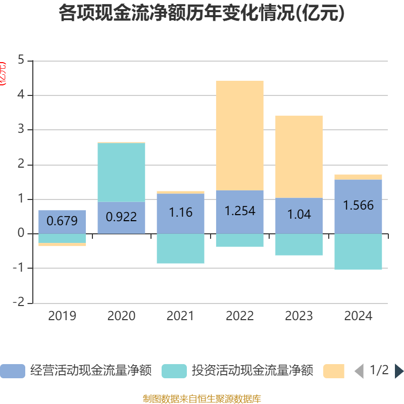 截至2024年,公司经营活动现金流净额为1.57亿元,同比增长50.5%;筹资活动现金流净额1427.71万元,同比减少2.23亿元;投资活动现金流净额-1.04亿元,上年同期为-6240.95万元。