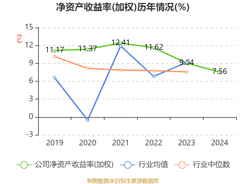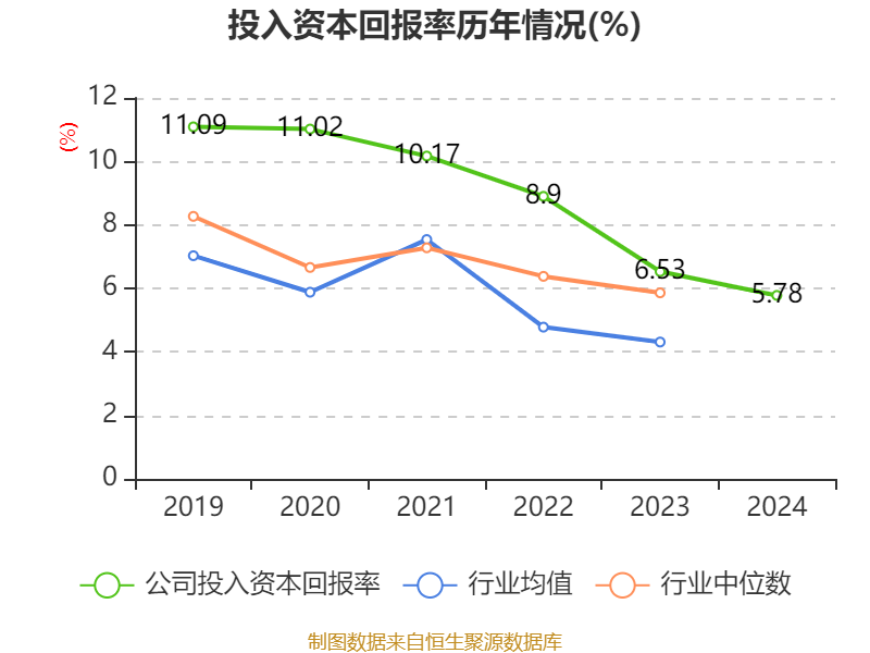 数据显示,2024年公司加权平均净资产收益率为7.56%,较上年同期下降1.48个百分点。公司2024年投入资本回报率为5.78%,较上年同期下降0.75个百分点。