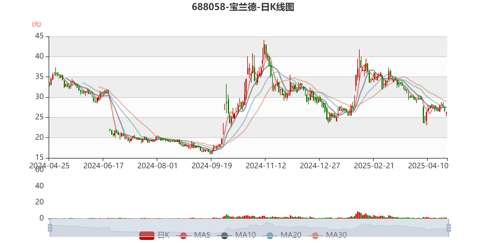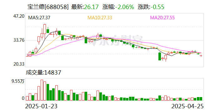 以4月24日收盘价计算,宝兰德目前市盈率(TTM)约为-35.37倍,市净率(LF)约2.86倍,市销率(TTM)约7.33倍。