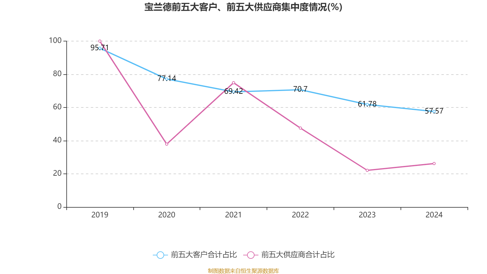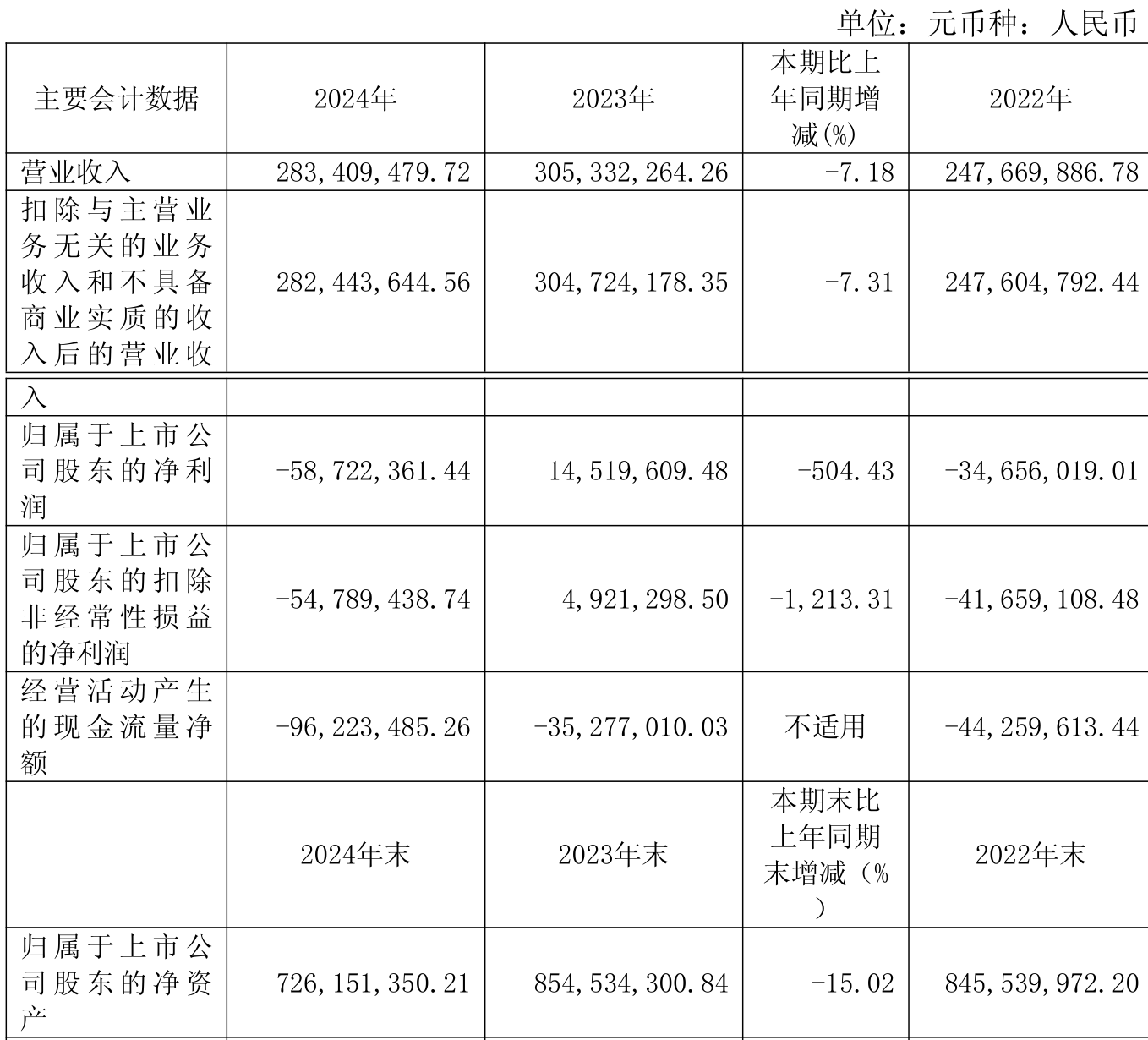 中证智能财讯宝兰德(维权)(688058)4月25日披露2024年年度报告。2024年,公司实现营业总收入2.83亿元,同比下降7.18%;归母净利润亏损5872.24万元,上年同期盈利1451.96万元;扣非净利润亏损5478.94万元,上年同期盈利492.13万元;经营活动产生的现金流量净额为-9622.35万元,上年同期为-3527.7万元;报告期内,宝兰德基本每股收益为-0.79元,加权平均净资产收益率为-7.66%。