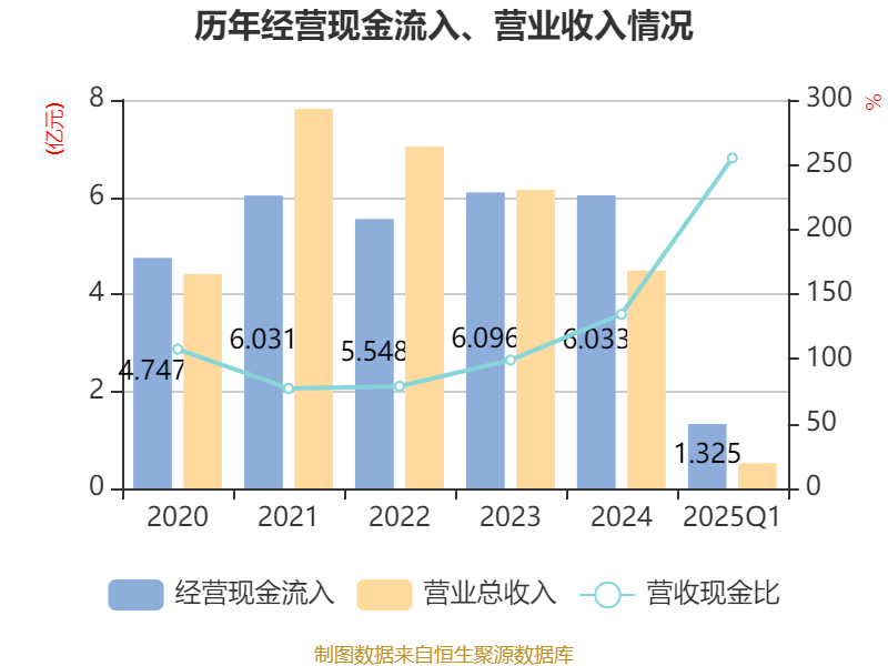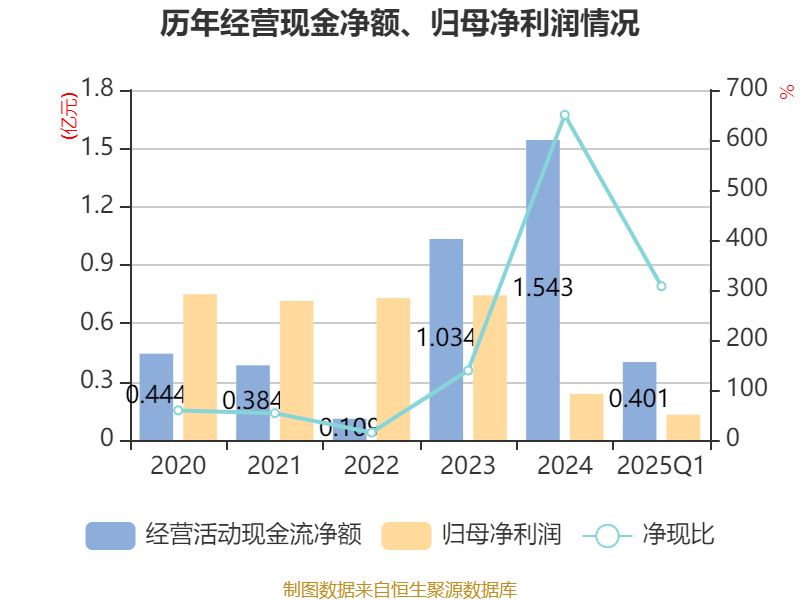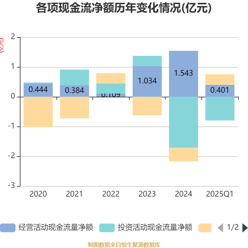截至2025年一季度末,公司经营活动现金流净额为4006.94万元,同比下降18.6%;筹资活动现金流净额3517.64万元,同比增加1408.41万元;投资活动现金流净额-7979.04万元,上年同期为-3260.39万元。