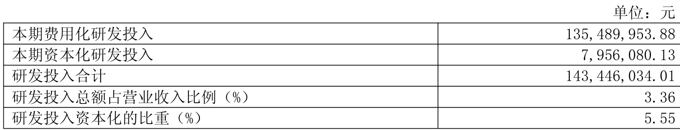 2024年全年,公司研发投入金额为1.43亿元,同比增长3.24%;研发投入占营业收入比例为3.36%,相比上年同期下降0.01个百分点。此外,公司全年研发投入资本化率为5.55%。