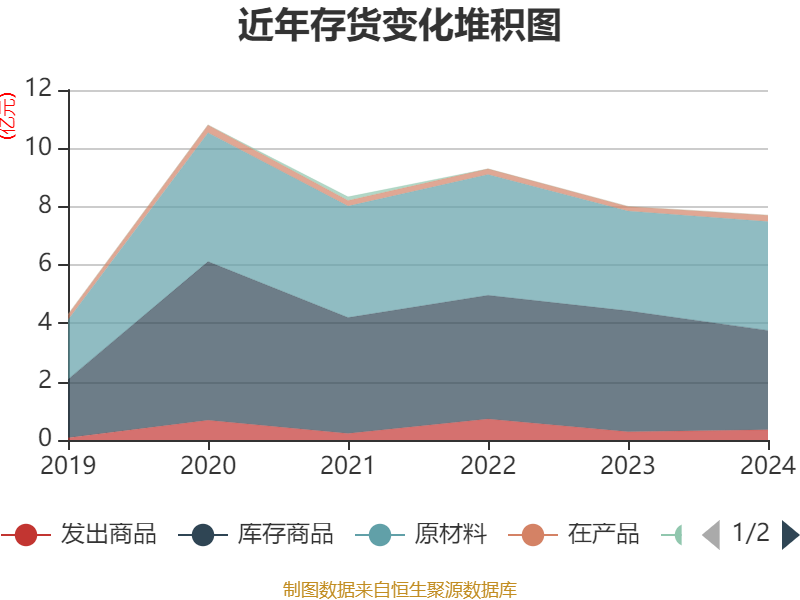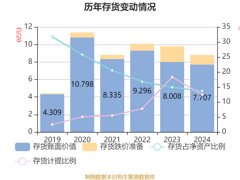从存货变动来看,截至2024年末,公司存货账面价值为7.71亿元,占净资产的13.66%,较上年末减少3008.47万元。其中,存货跌价准备为1.1亿元,计提比例为12.48%。