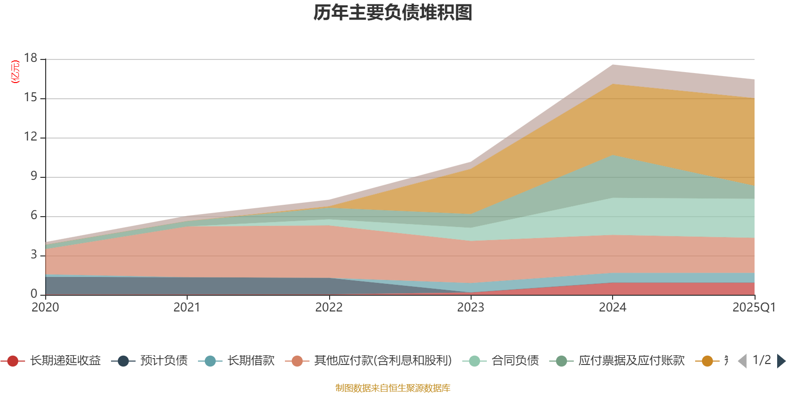 负债重大变化方面,截至2025年一季度末,公司应付票据及应付账款较上年末减少69.57%,占公司总资产比重下降12.64个百分点;短期借款较上年末增加23.11%,占公司总资产比重上升10.09个百分点;合同负债较上年末增加5.2%,占公司总资产比重上升2.13个百分点;长期递延收益较上年末减少0.4%,占公司总资产比重上升0.37个百分点。