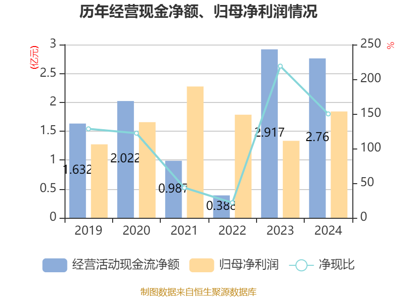 截至2024年,公司经营活动现金流净额为2.76亿元,同比下降5.39%;筹资活动现金流净额-1.61亿元,同比减少1.49亿元;投资活动现金流净额-9783.16万元,上年同期为-1.56亿元。