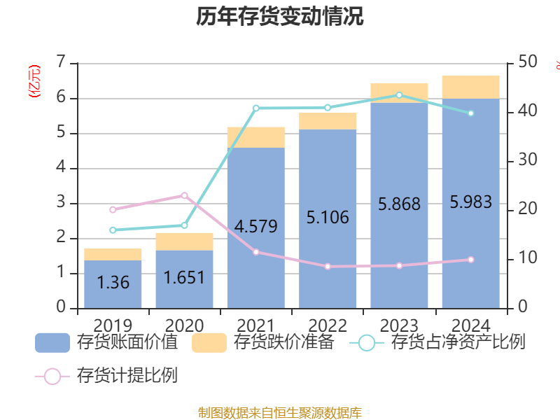 从存货变动来看,截至2024年末,公司存货账面价值为5.98亿元,占净资产的39.74%,较上年末增加1147.51万元。其中,存货跌价准备为6551.19万元,计提比例为9.87%。