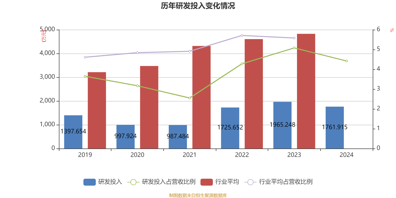 2024年全年,公司研发投入金额为1761.91万元,同比下降10.35%;研发投入占营业收入比例为4.42%,相比上年同期下降0.66个百分点。此外,公司全年研发投入资本化率为0%。