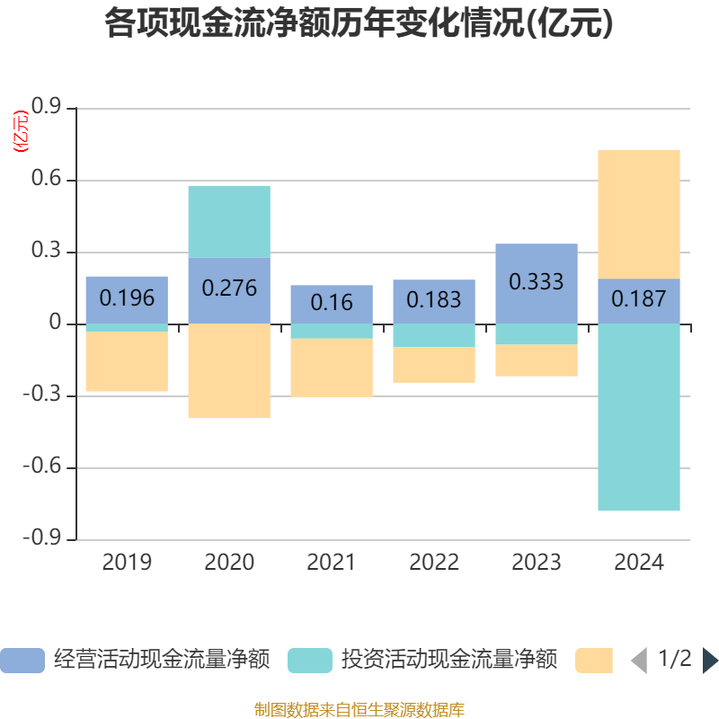 截至2024年,公司经营活动现金流净额为1868.81万元,同比下降43.83%;筹资活动现金流净额5372.31万元,同比增加6692.42万元;投资活动现金流净额-7810.36万元,上年同期为-882.45万元。