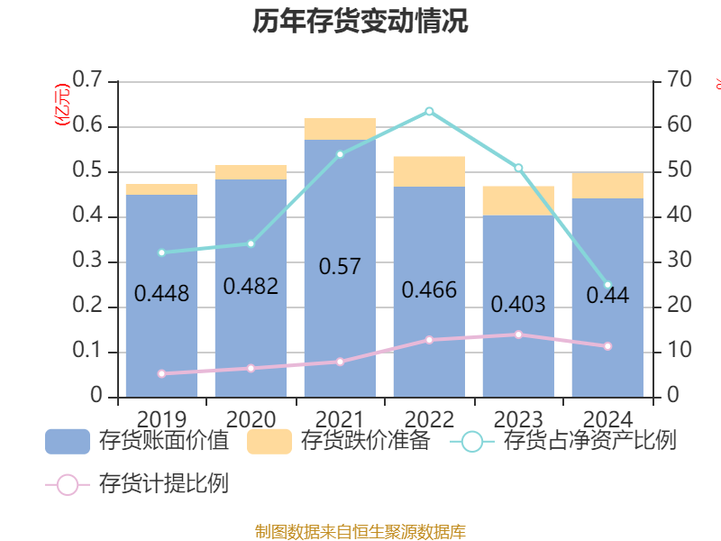 从存货变动来看,截至2024年末,公司存货账面价值为4403.33万元,占净资产的24.85%,较上年末增加375.61万元。其中,存货跌价准备为555.45万元,计提比例为11.2%。