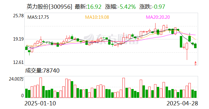 4月28日,英力股份(300956)公布2025年一季报,公司营业收入为4.46亿元,同比上升23.0%;归母净利润为315万元,同比下降13.0%;扣非归母净利润为273万元,同比下降54.1%;经营现金流净额为9051万元,同比下降11.4%;EPS(全面摊薄)为0.0175元。