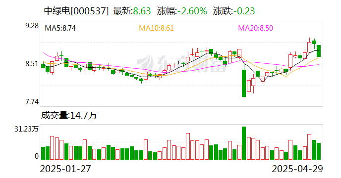 4月28日,中绿电(维权)(000537)公布2025年一季报,公司营业收入为10.3亿元,同比上升19.8%;归母净利润为2.54亿元,同比上升52.2%;扣非归母净利润为2.54亿元,同比上升52.2%;经营现金流净额为5.79亿元,同比增长114.7%;EPS(全面摊薄)为0.123元。