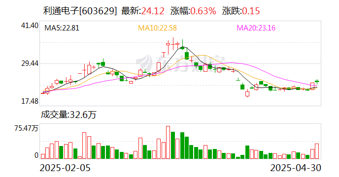 中证智能财讯利通电子(603629)4月29日披露2025年第一季度报告。公司实现营业总收入7.04亿元,同比增长64.62%;归母净利润2945.15万元,同比下降11.01%;扣非净利润2897.54万元,同比下降1.90%;经营活动产生的现金流量净额为1.92亿元,同比下降62.79%;报告期内,利通电子基本每股收益为0.11元,加权平均净资产收益率为1.76%。