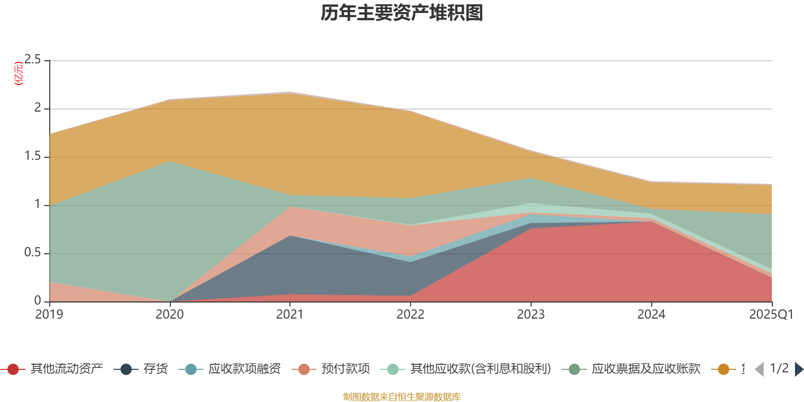 资产重大变化方面,截至2025年一季度末,公司其他流动资产较上年末减少70.52%,占公司总资产比重下降46.36个百分点;应收票据及应收账款较上年末增加1010.85%,占公司总资产比重上升42.68个百分点;货币资金较上年末增加10.62%,占公司总资产比重上升2.87个百分点;预付款项较上年末增加28.66%,占公司总资产比重上升0.91个百分点。