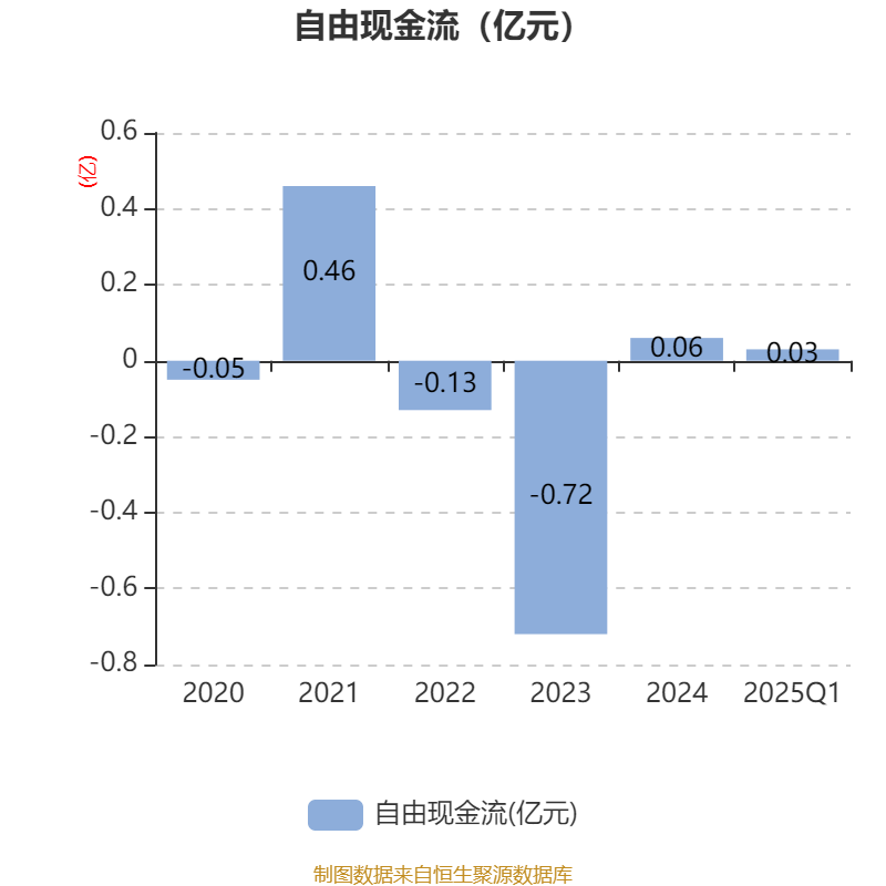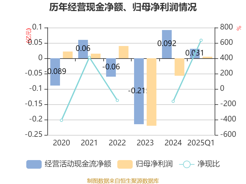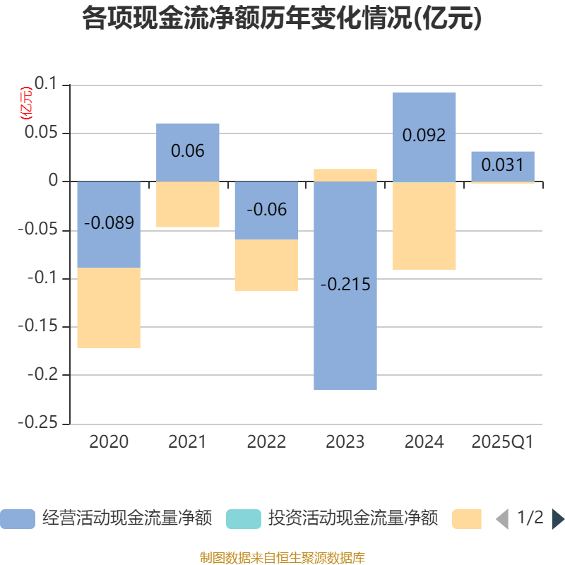 截至2025年一季度末,公司经营活动现金流净额为305.08万元,同比增长199.76%;筹资活动现金流净额-16.41万元,同比增加889.46万元;投资活动现金流净额0元,上年同期为-4999元。