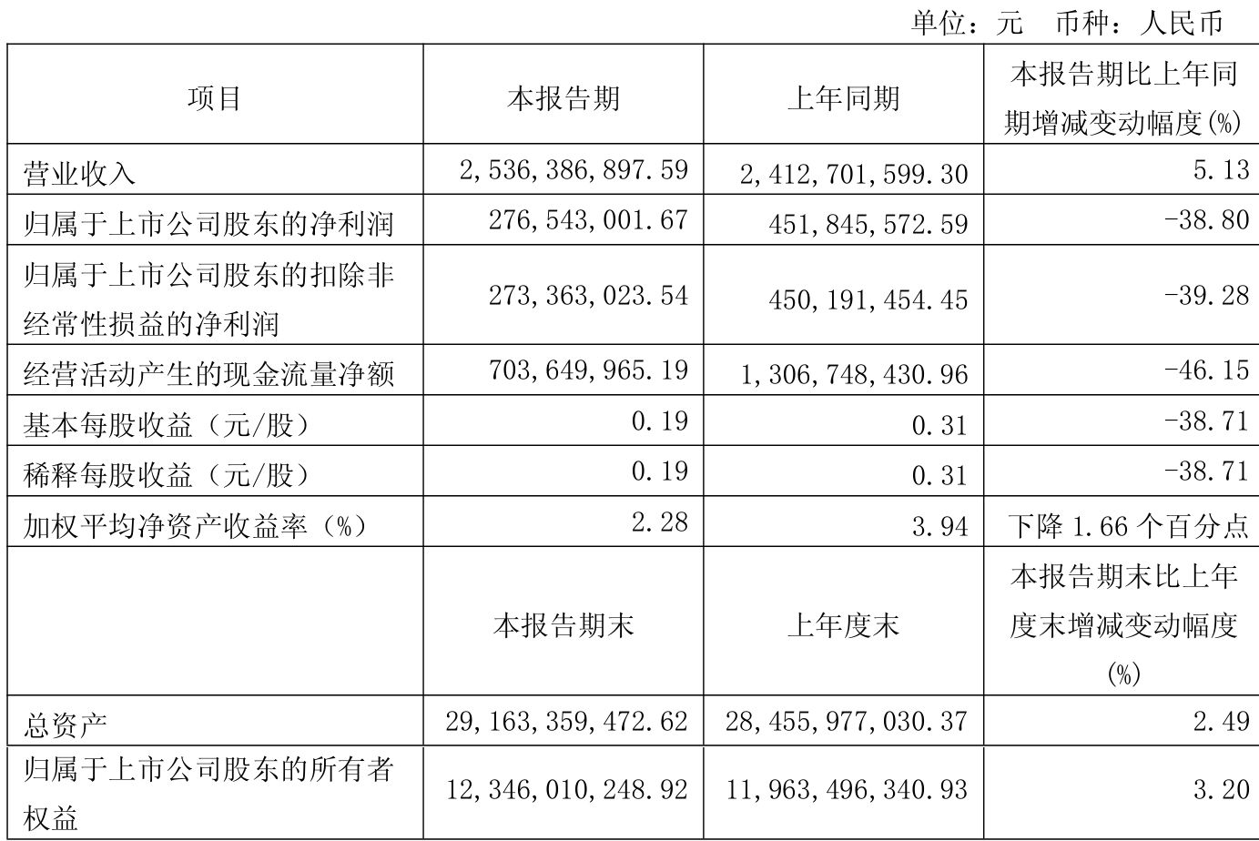 中证智能财讯昊华能源(601101)4月29日披露2025年第一季度报告。公司实现营业总收入25.36亿元,同比增长5.13%;归母净利润2.77亿元,同比下降38.80%;扣非净利润2.73亿元,同比下降39.28%;经营活动产生的现金流量净额为7.04亿元,同比下降46.15%;报告期内,昊华能源基本每股收益为0.19元,加权平均净资产收益率为2.28%。