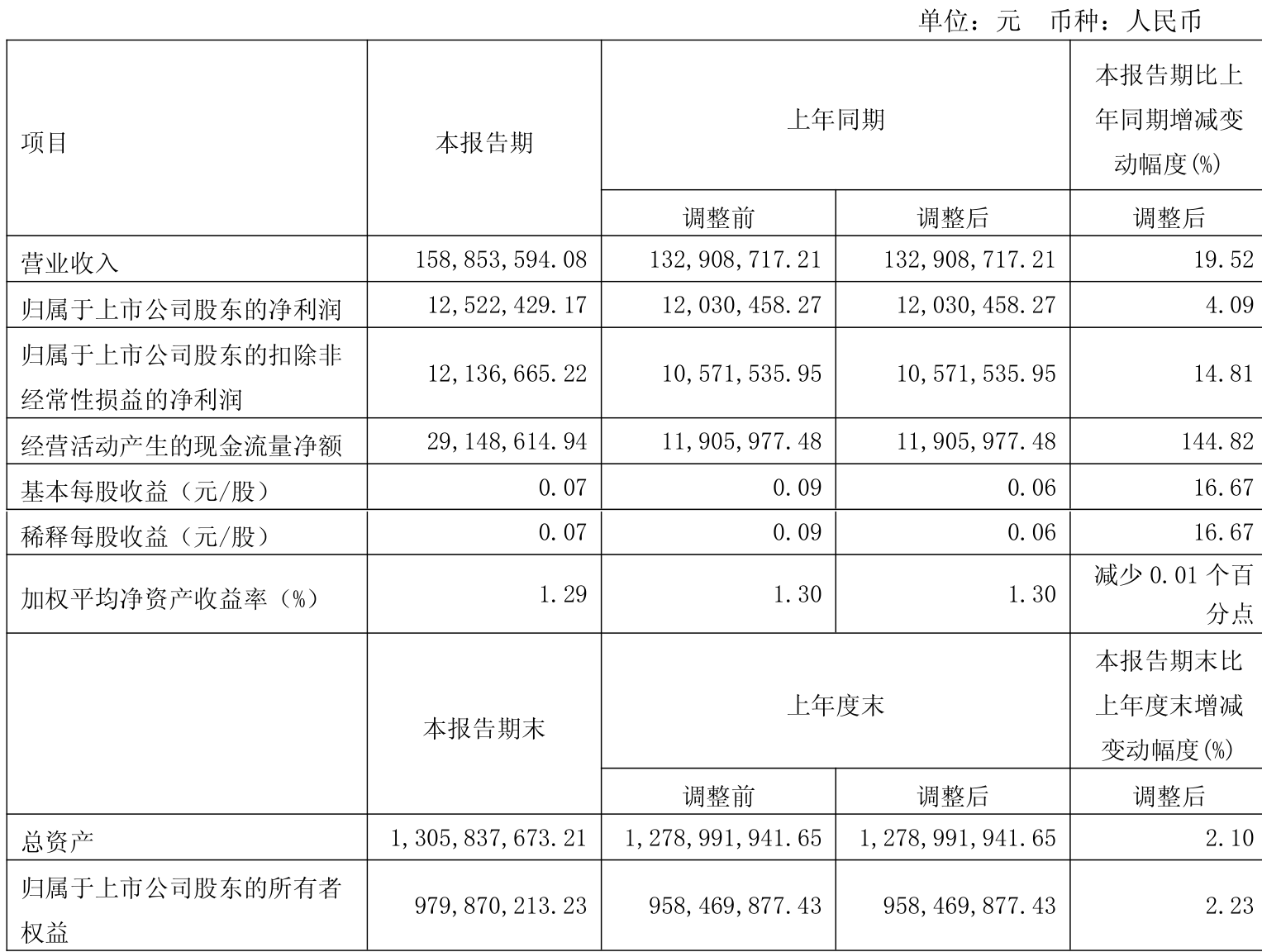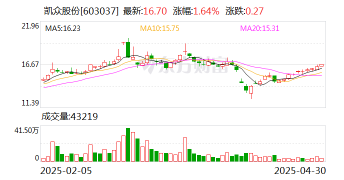 中证智能财讯凯众股份(603037)4月29日披露2025年第一季度报告。公司实现营业总收入1.59亿元,同比增长19.52%;归母净利润1252.24万元,同比增长4.09%;扣非净利润1213.67万元,同比增长14.81%;经营活动产生的现金流量净额为2914.86万元,同比增长144.82%;报告期内,凯众股份基本每股收益为0.07元,加权平均净资产收益率为1.29%。