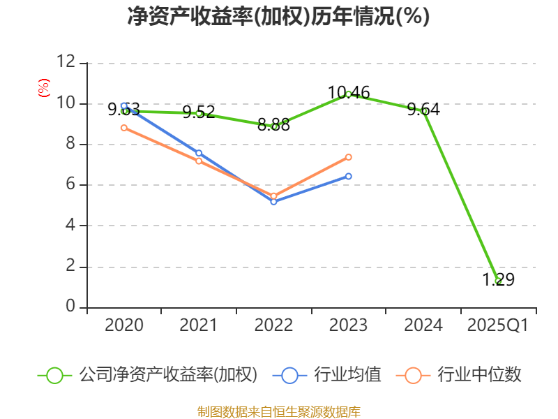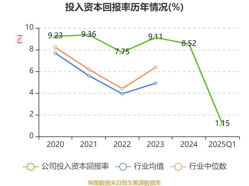 盈利能力方面, 2025年一季度公司加权平均净资产收益率为1.29%,同比下降0.01个百分点。公司2025年第一季度投入资本回报率为1.15%,较上年同期上升0.02个百分点。