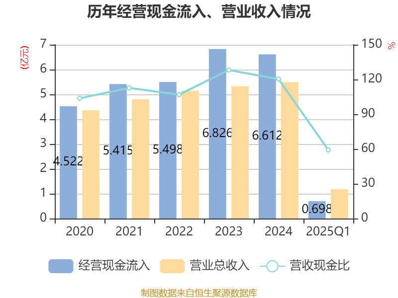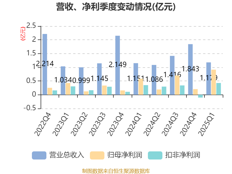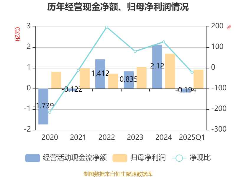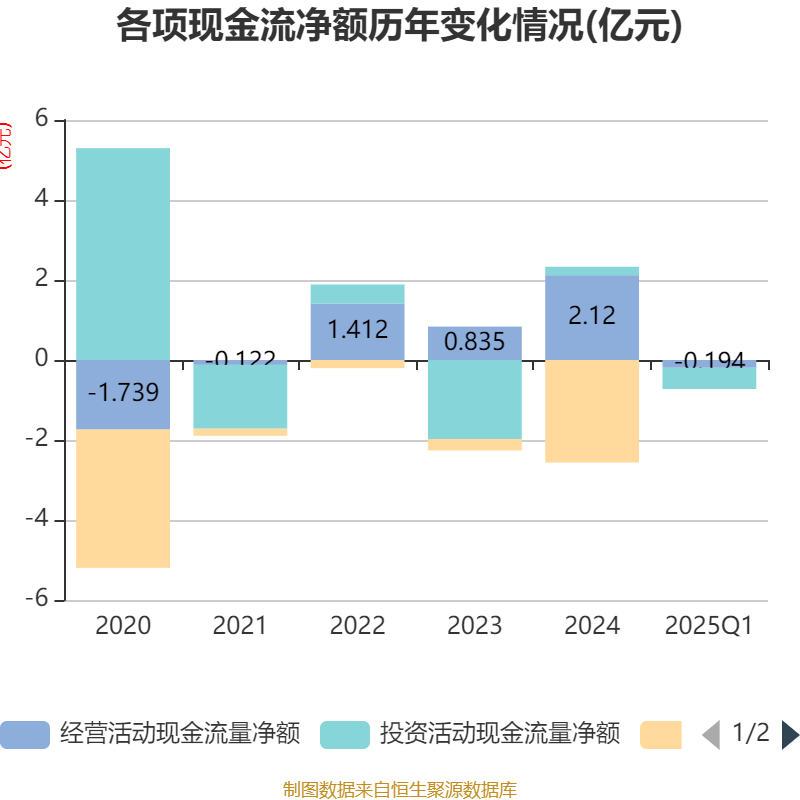 截至2025年一季度末,公司经营活动现金流净额为-1935.6万元,同比增加2633.04万元;筹资活动现金流净额0元,同比减少9884.39万元;投资活动现金流净额-5311.77万元,上年同期为4715.47万元。