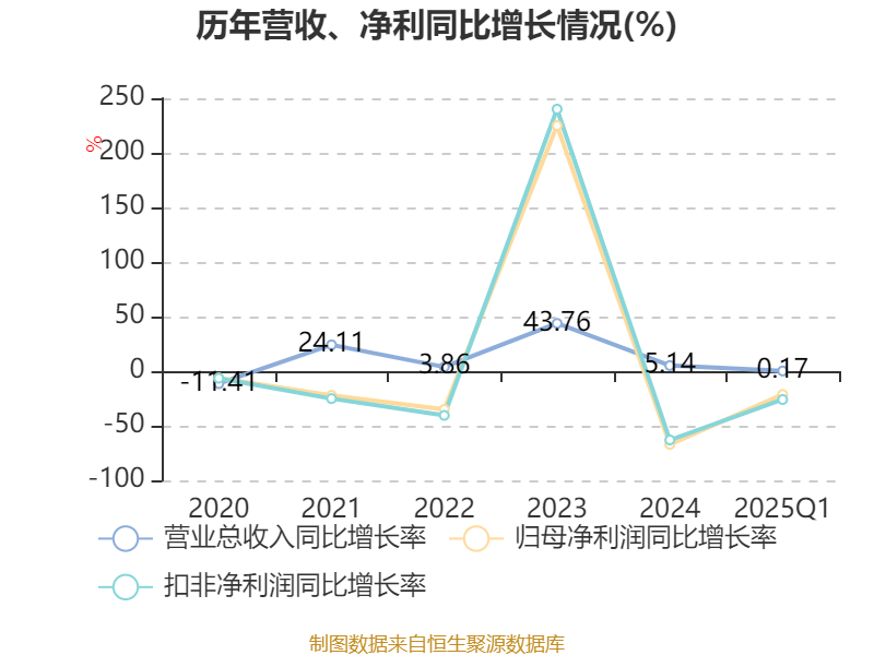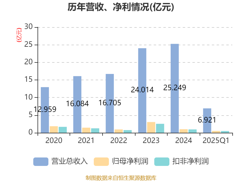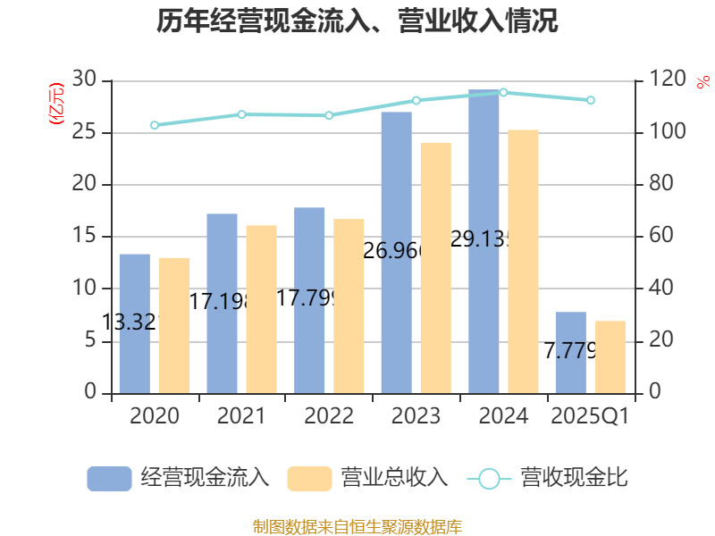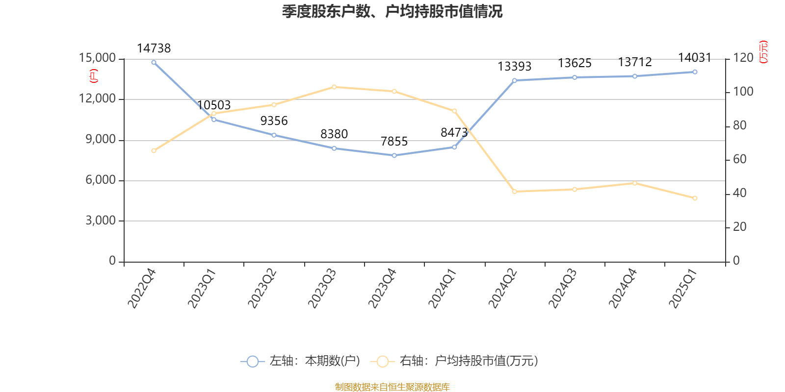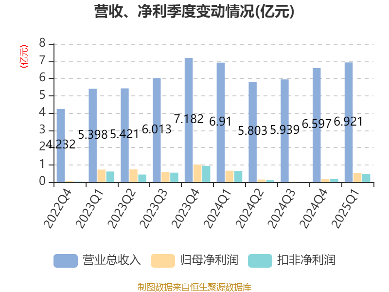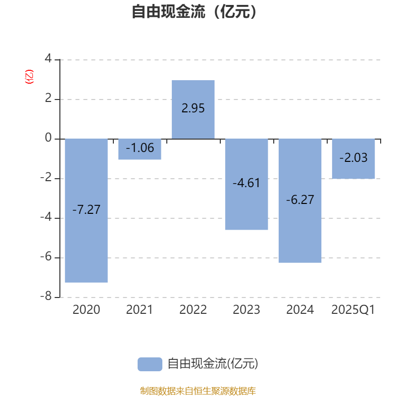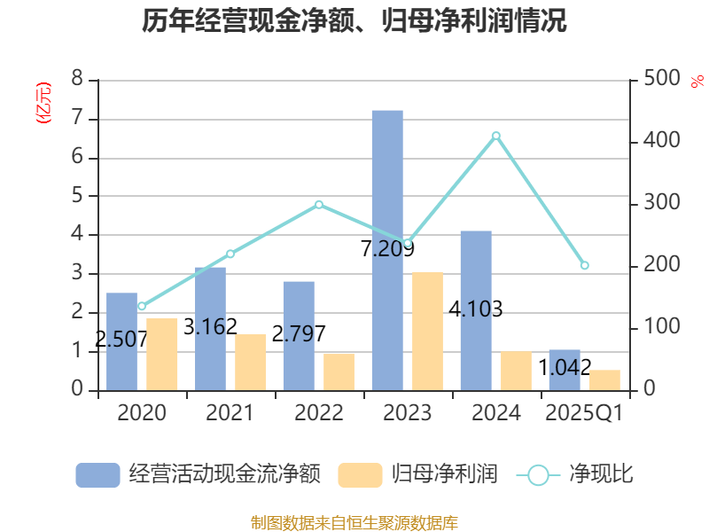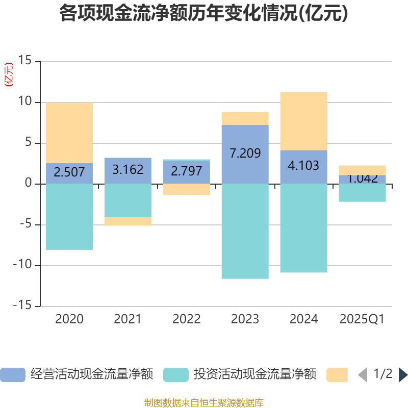 截至2025年一季度末,公司经营活动现金流净额为1.04亿元,同比下降44.82%;筹资活动现金流净额1.18亿元,同比减少1.57亿元;投资活动现金流净额-2.23亿元,上年同期为-5.22亿元。