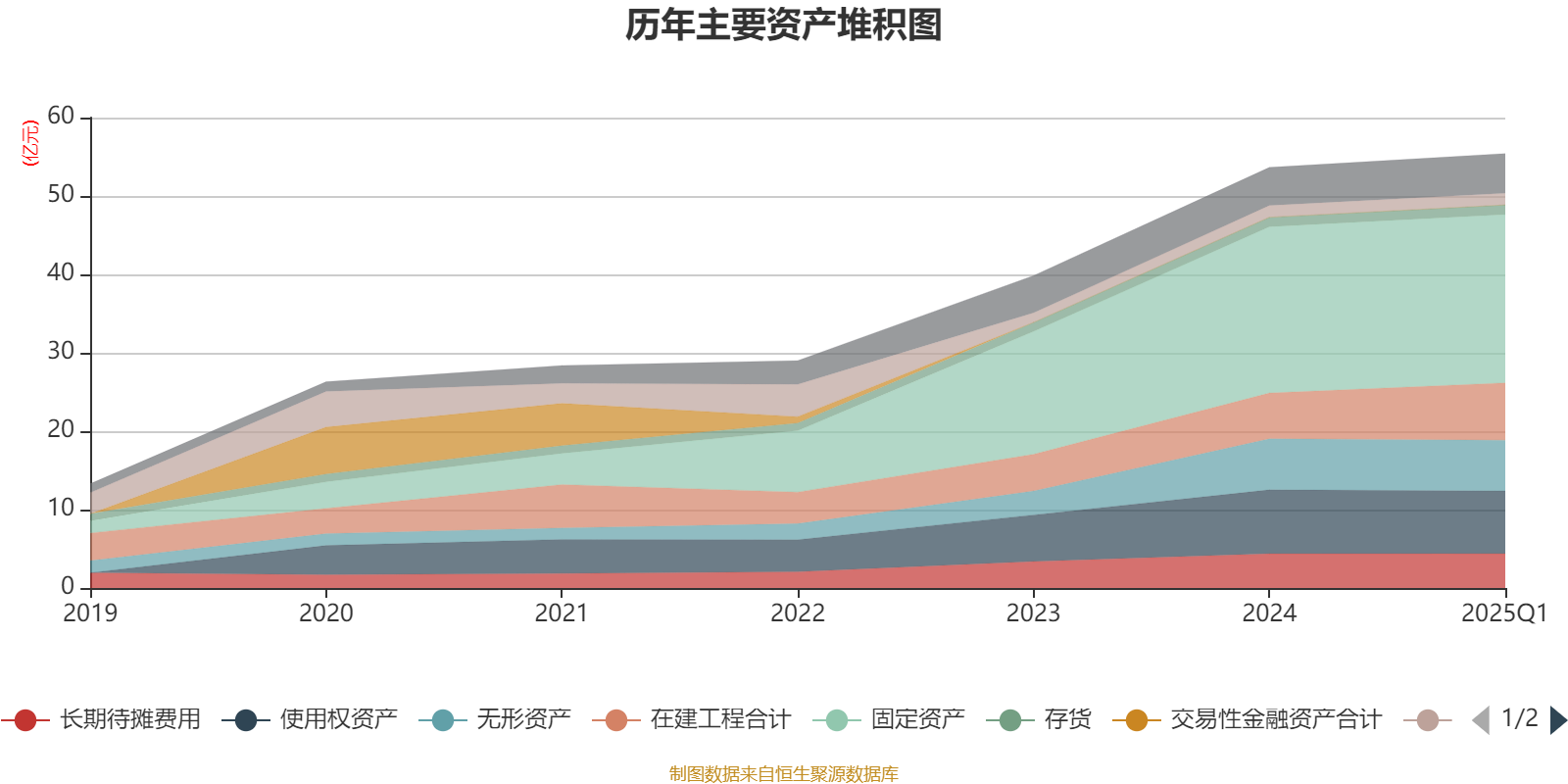 资产重大变化方面,截至2025年一季度末,公司在建工程合计较上年末增加25.19%,占公司总资产比重上升2.31个百分点;使用权资产较上年末减少2.11%,占公司总资产比重下降0.8个百分点;固定资产较上年末增加1.28%,占公司总资产比重下降0.77个百分点;无形资产较上年末减少0.52%,占公司总资产比重下降0.45个百分点。
