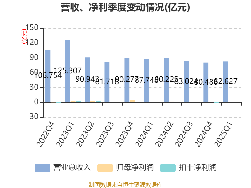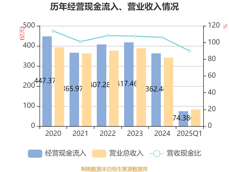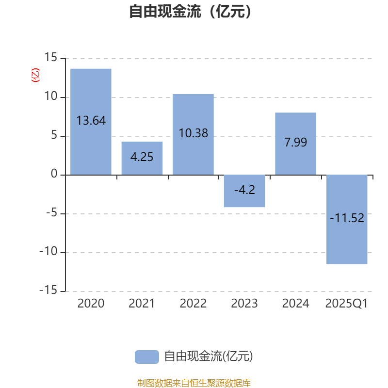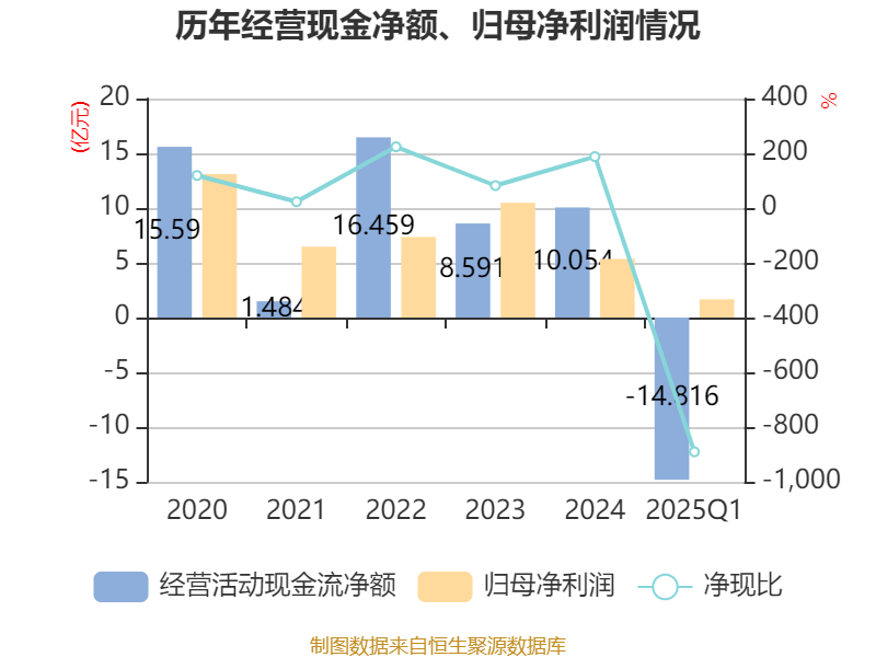 截至2025年一季度末,公司经营活动现金流净额为-14.82亿元,同比减少2.75亿元;筹资活动现金流净额4669.95万元,同比减少1.9亿元;投资活动现金流净额-5730.96万元,上年同期为-8827.2万元。