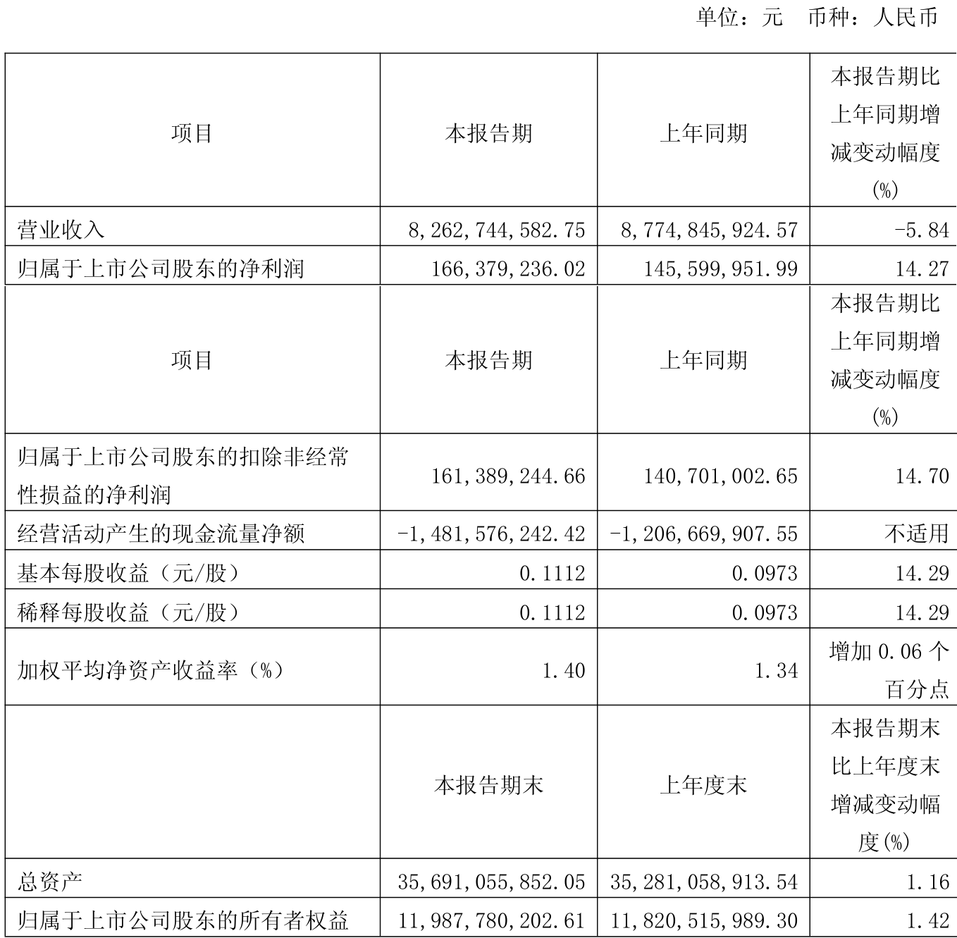 中证智能财讯中国医药(600056)4月30日披露2025年第一季度报告。公司实现营业总收入82.63亿元,同比下降5.84%;归母净利润1.66亿元,同比增长14.27%;扣非净利润1.61亿元,同比增长14.70%;经营活动产生的现金流量净额为-14.82亿元,上年同期为-12.07亿元;报告期内,中国医药基本每股收益为0.1112元,加权平均净资产收益率为1.40%。