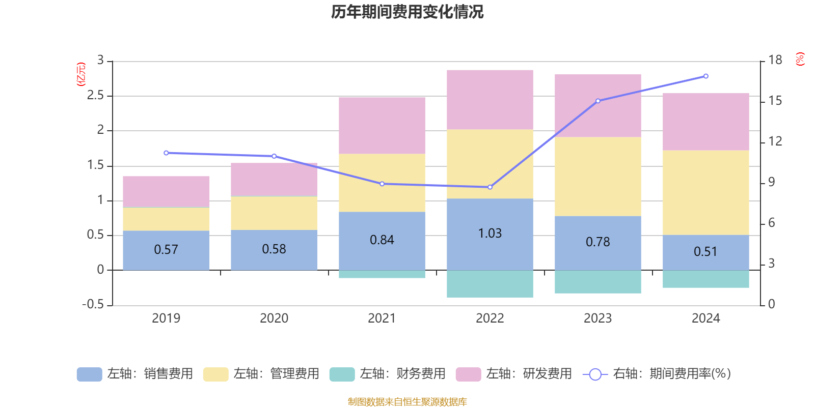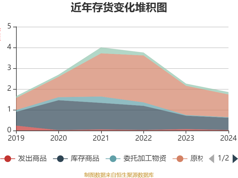 从存货变动来看,截至2024年末,公司存货账面价值为1.85亿元,占净资产的6.98%,较上年末减少4103.54万元。其中,存货跌价准备为5038.04万元,计提比例为21.45%。