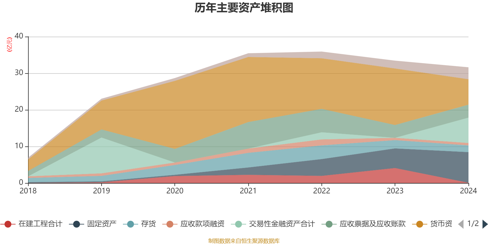 资产重大变化方面,截至2024年末,公司货币资金较上年末减少55.01%,占公司总资产比重下降24.21个百分点;交易性金融资产合计占公司总资产的21.9%,上年末为0;在建工程合计较上年末减少98.45%,占公司总资产比重下降12.02个百分点;固定资产较上年末增加55.98%,占公司总资产比重上升10.42个百分点。