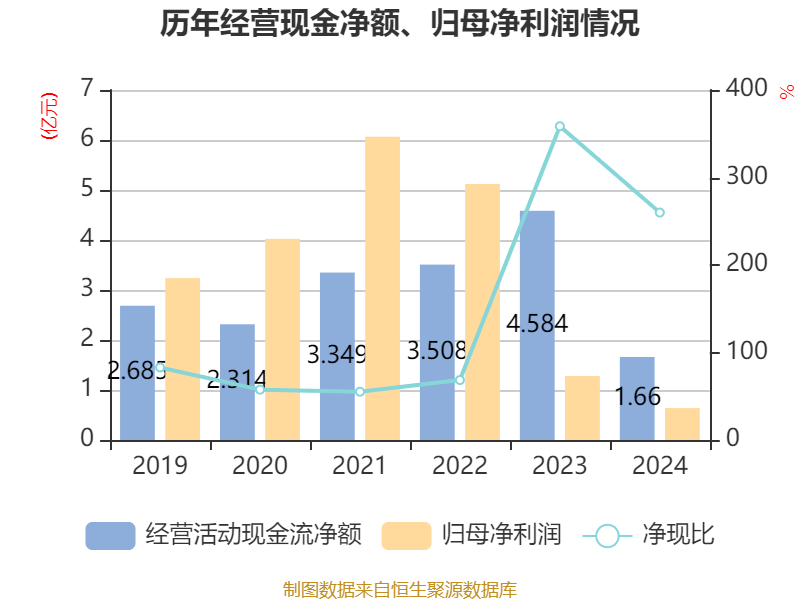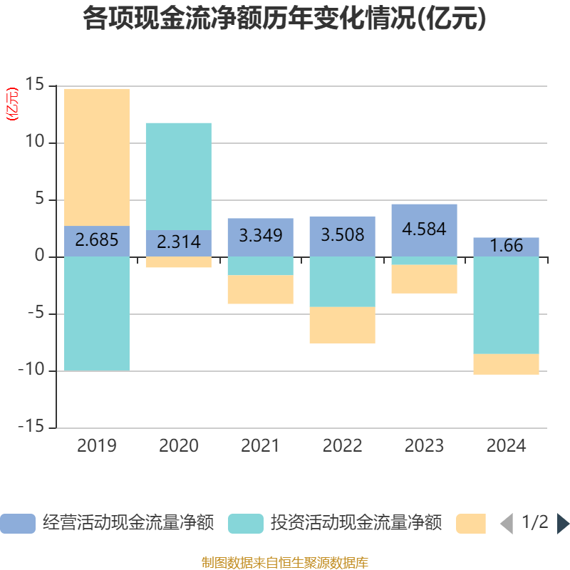 截至2024年,公司经营活动现金流净额为1.66亿元,同比下降63.79%;筹资活动现金流净额-1.81亿元,同比增加6956.88万元;投资活动现金流净额-8.55亿元,上年同期为-7311.97万元。