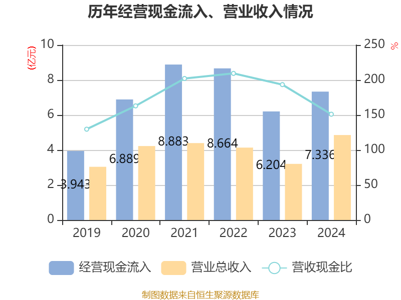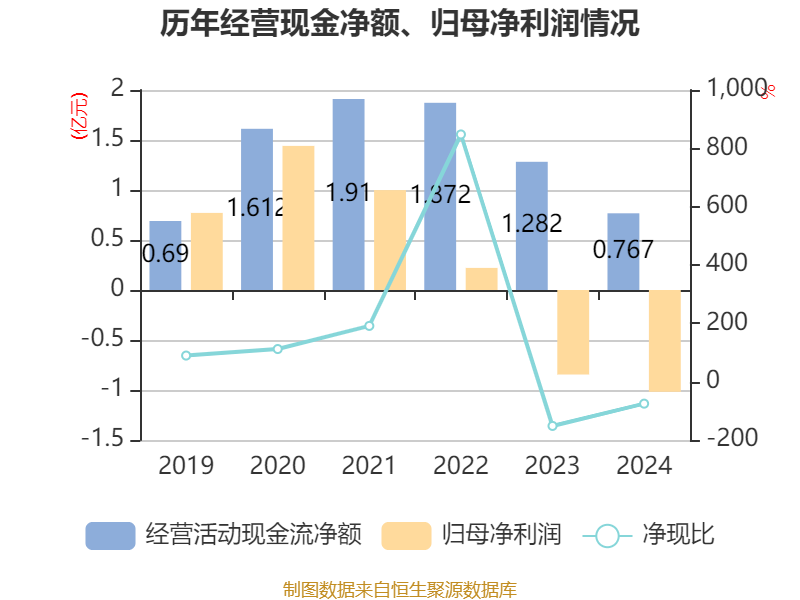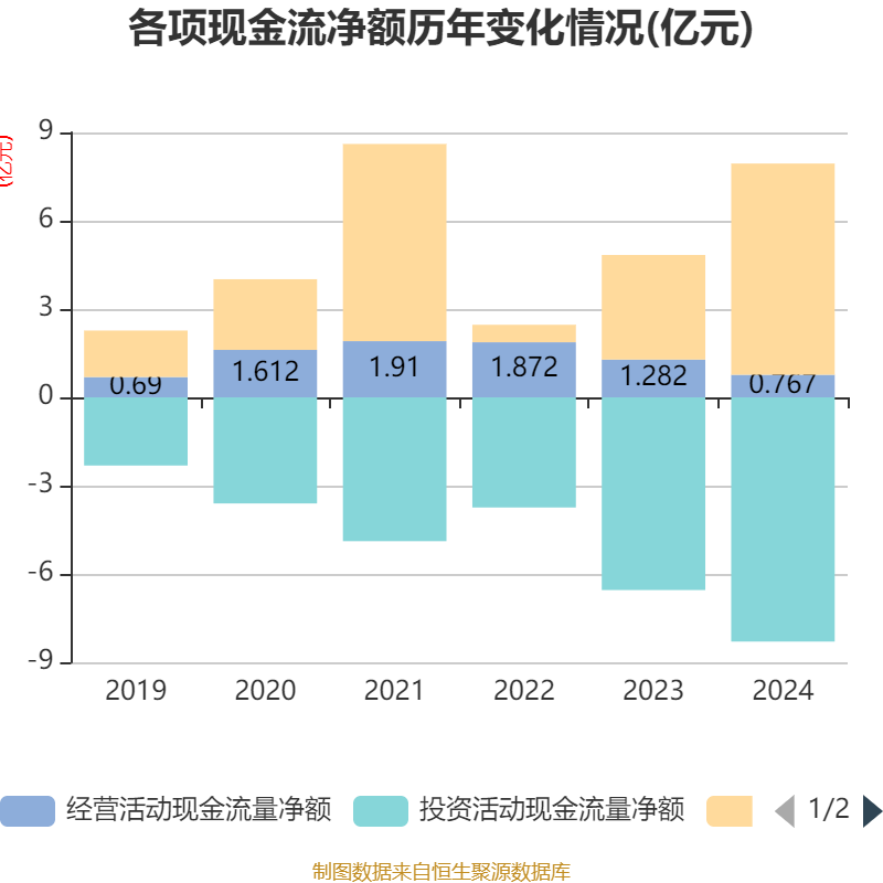 截至2024年,公司经营活动现金流净额为7672.71万元,同比下降40.14%;筹资活动现金流净额7.18亿元,同比增加3.62亿元;投资活动现金流净额-8.3亿元,上年同期为-6.55亿元。