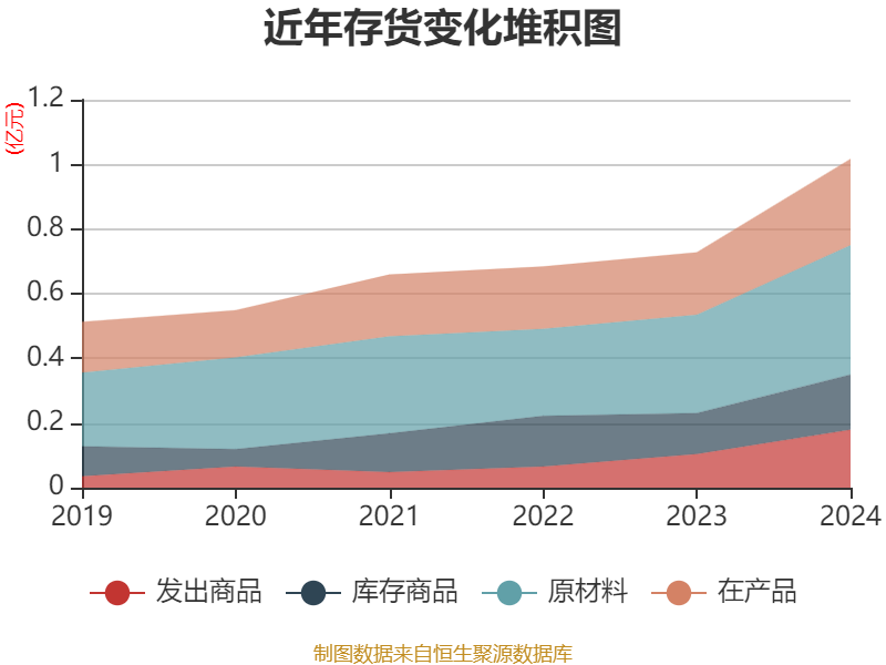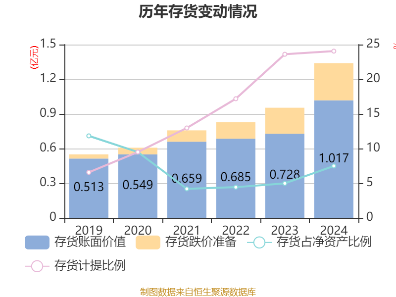 从存货变动来看,截至2024年末,公司存货账面价值为1.02亿元,占净资产的7.48%,较上年末增加2896.56万元。其中,存货跌价准备为3221.92万元,计提比例为24.05%。