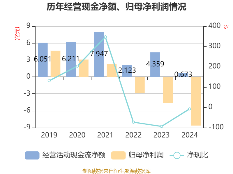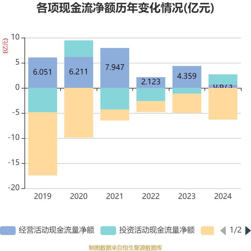 截至2024年,公司经营活动现金流净额为6726.3万元,同比下降84.57%;筹资活动现金流净额-6.34亿元,同比减少2.52亿元;投资活动现金流净额2.01亿元,上年同期为-1.16亿元。