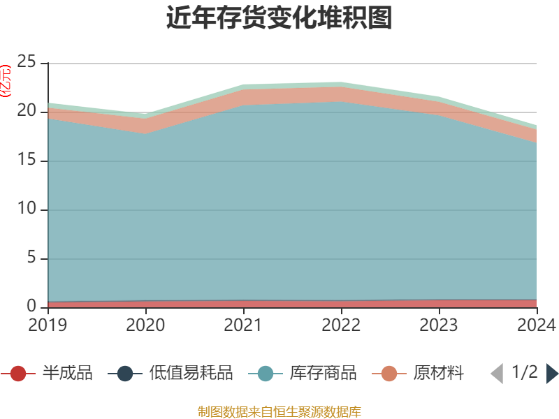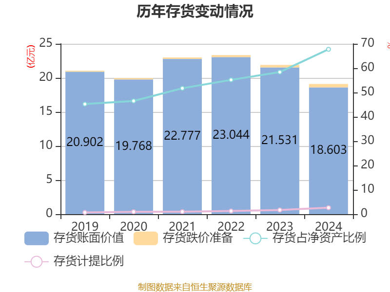 从存货变动来看,截至2024年末,公司存货账面价值为18.6亿元,占净资产的67.74%,较上年末减少2.93亿元。其中,存货跌价准备为5050.08万元,计提比例为2.64%。