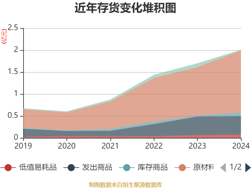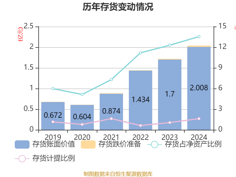 从存货变动来看,截至2024年末,公司存货账面价值为2.01亿元,占净资产的13.54%,较上年末增加3079.76万元。其中,存货跌价准备为330.17万元,计提比例为1.62%。