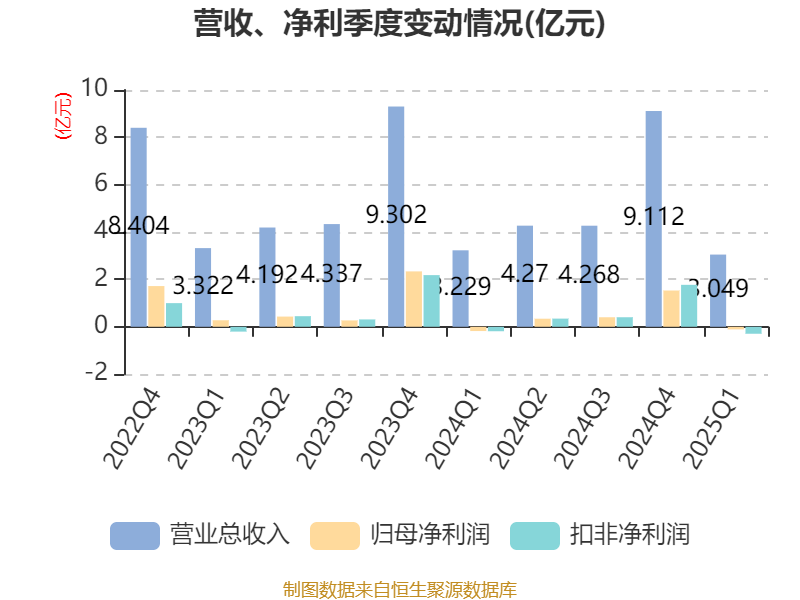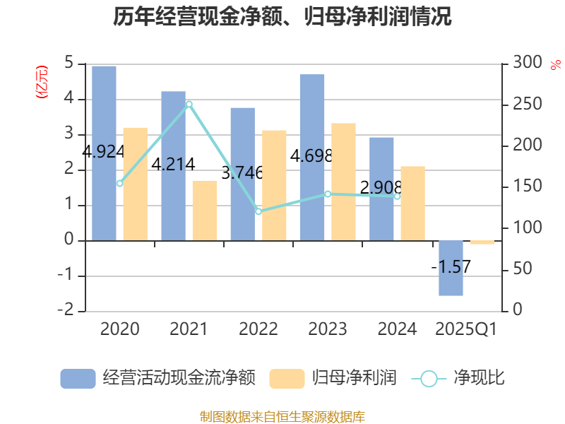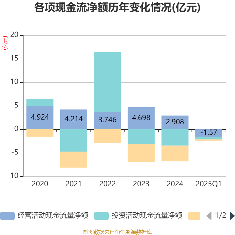 截至2025年一季度末,公司经营活动现金流净额为-1.57亿元,同比增加5705.91万元;筹资活动现金流净额-2670.72万元,同比增加559.68万元;投资活动现金流净额-5912.62万元,上年同期为-3.93亿元。