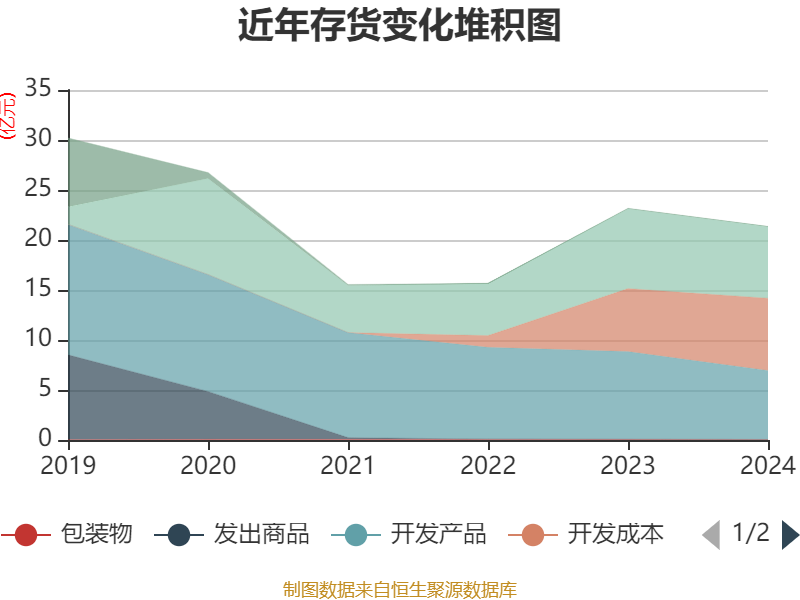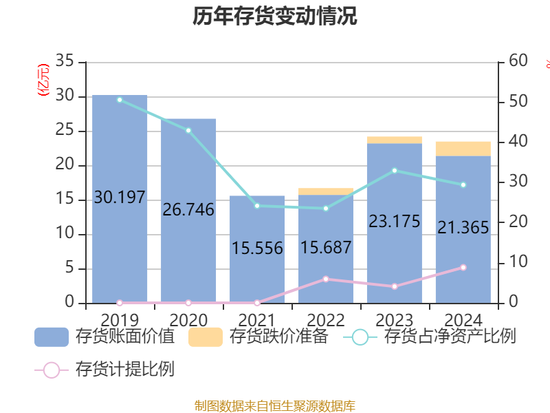 从存货变动来看,截至2024年末,公司存货账面价值为21.37亿元,占净资产的29.39%,较上年末减少1.81亿元。其中,存货跌价准备为2.07亿元,计提比例为8.82%。