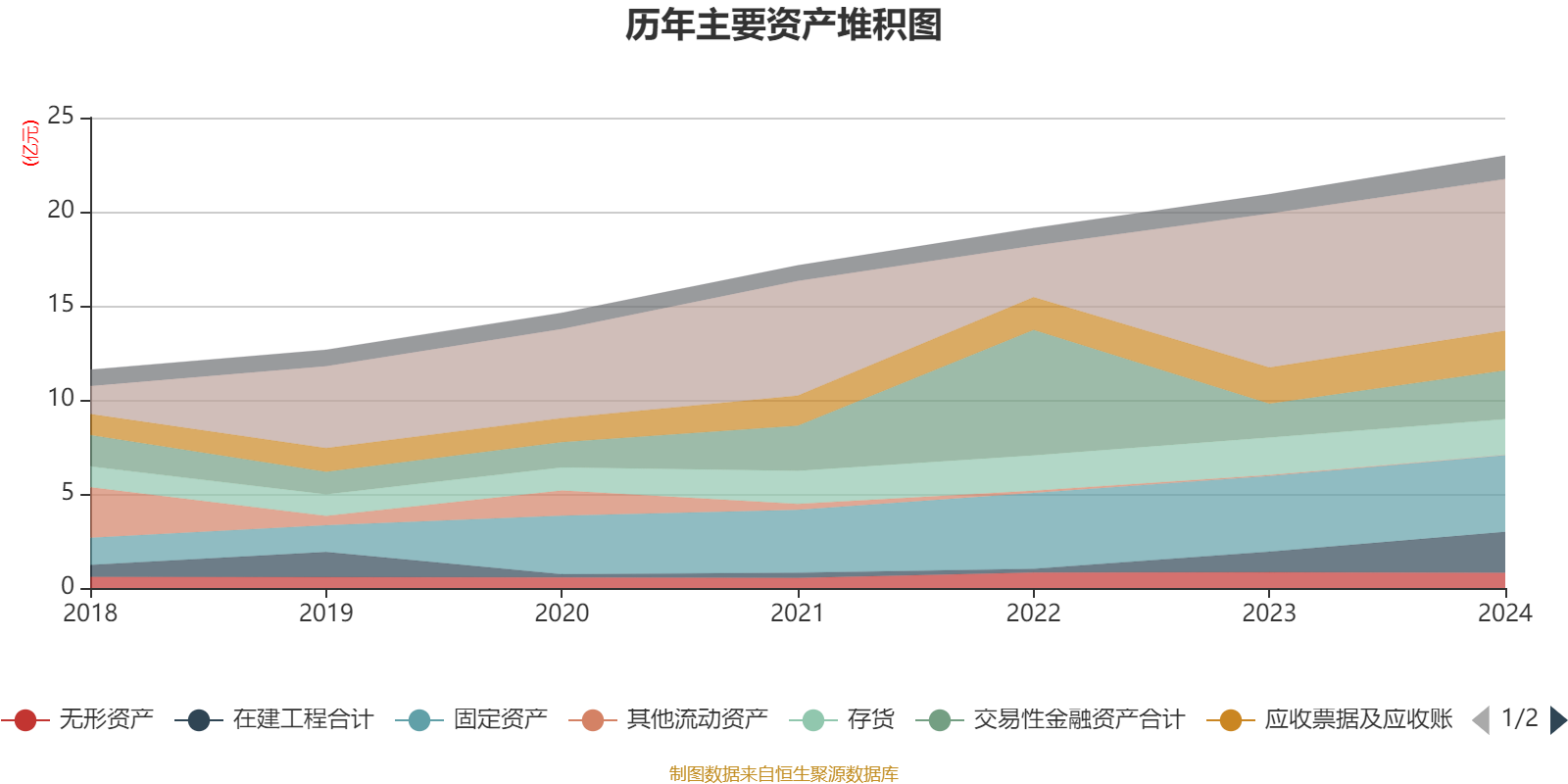 资产重大变化方面,截至2024年末,公司在建工程合计较上年末增加98.2%,占公司总资产比重上升4.2个百分点;货币资金较上年末减少1.57%,占公司总资产比重下降4.06个百分点;交易性金融资产合计较上年末增加43.77%,占公司总资产比重上升2.66个百分点;固定资产较上年末增加1.42%,占公司总资产比重下降1.48个百分点。