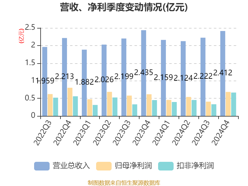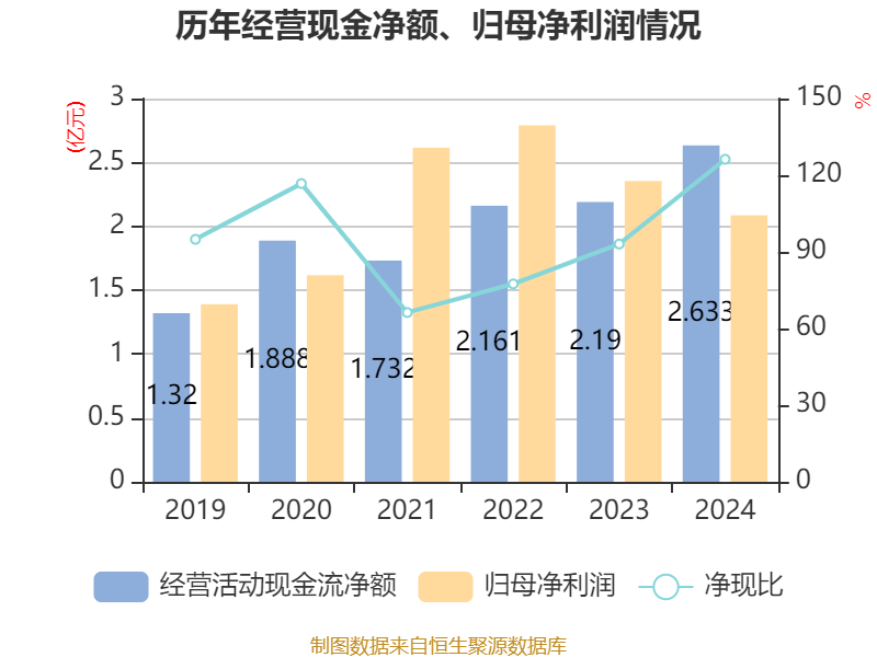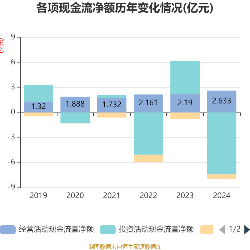 截至2024年,公司经营活动现金流净额为2.63亿元,同比增长20.23%;筹资活动现金流净额-5504.45万元,同比增加2542.95万元;投资活动现金流净额-7.43亿元,上年同期为4亿元。