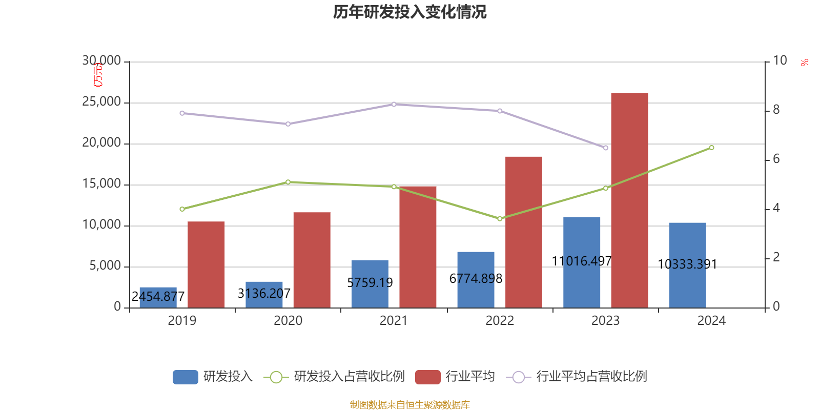 2024年全年,公司研发投入金额为1.03亿元,同比下降6.2%;研发投入占营业收入比例为6.5%,相比上年同期上升1.65个百分点。此外,公司全年研发投入资本化率为0%。