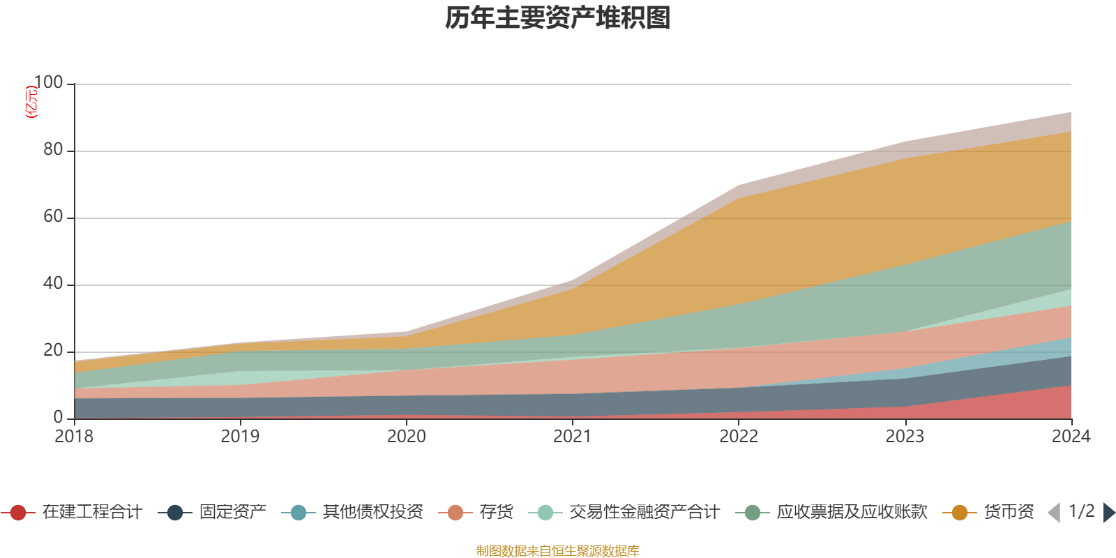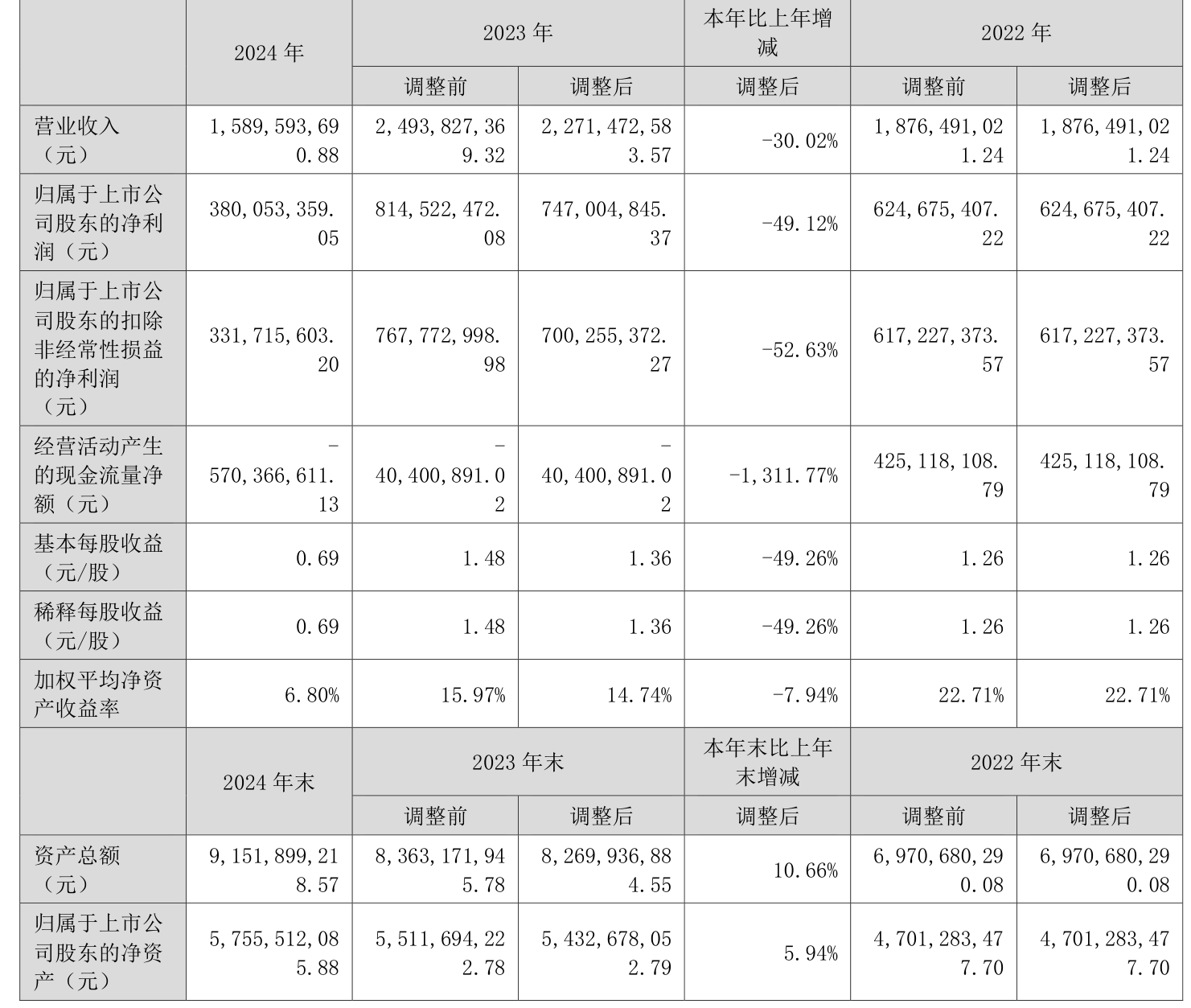 资产重大变化方面,截至2024年末,公司货币资金较上年末减少15.6%,占公司总资产比重下降9.1个百分点;在建工程合计较上年末增加179.69%,占公司总资产比重上升6.55个百分点;交易性金融资产合计占公司总资产的5.46%,上年末为0;存货较上年末减少13.86%,占公司总资产比重下降2.93个百分点。
