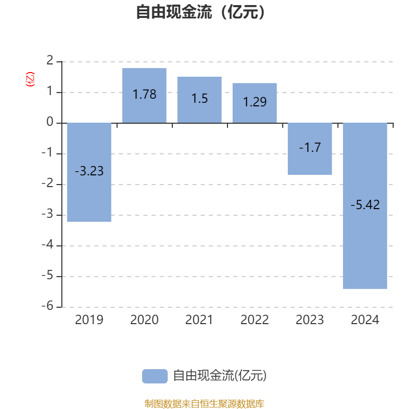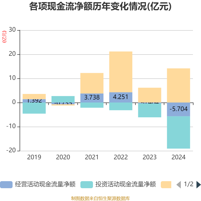 截至2024年,公司经营活动现金流净额为-5.7亿元,同比减少5.3亿元;筹资活动现金流净额14.15亿元,同比增加8.02亿元;投资活动现金流净额-13.41亿元,上年同期为-5.74亿元。