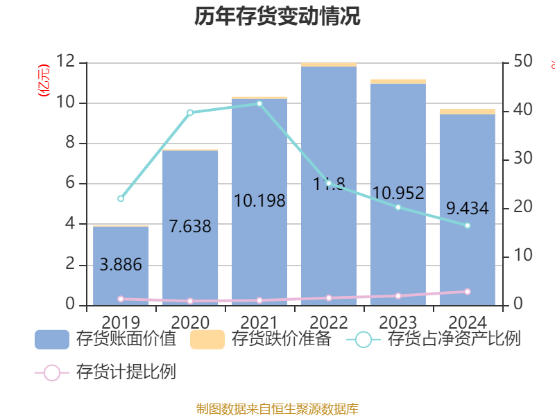 从存货变动来看,截至2024年末,公司存货账面价值为9.43亿元,占净资产的16.39%,较上年末减少1.52亿元。其中,存货跌价准备为2686.56万元,计提比例为2.77%。