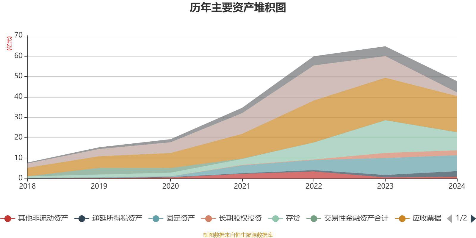 资产重大变化方面,截至2024年末,公司货币资金较上年末减少83.17%,占公司总资产比重下降12.72个百分点;存货较上年末减少44.93%,占公司总资产比重下降6.27个百分点;应收票据及应收账款较上年末减少14.68%,占公司总资产比重上升5.06个百分点;递延所得税资产较上年末增加133.68%,占公司总资产比重上升3.82个百分点。