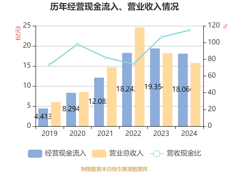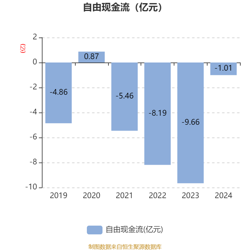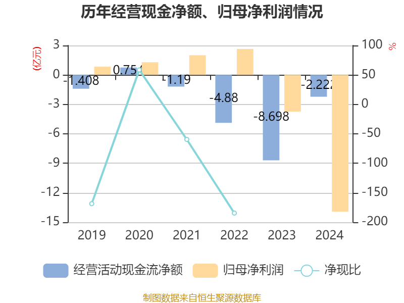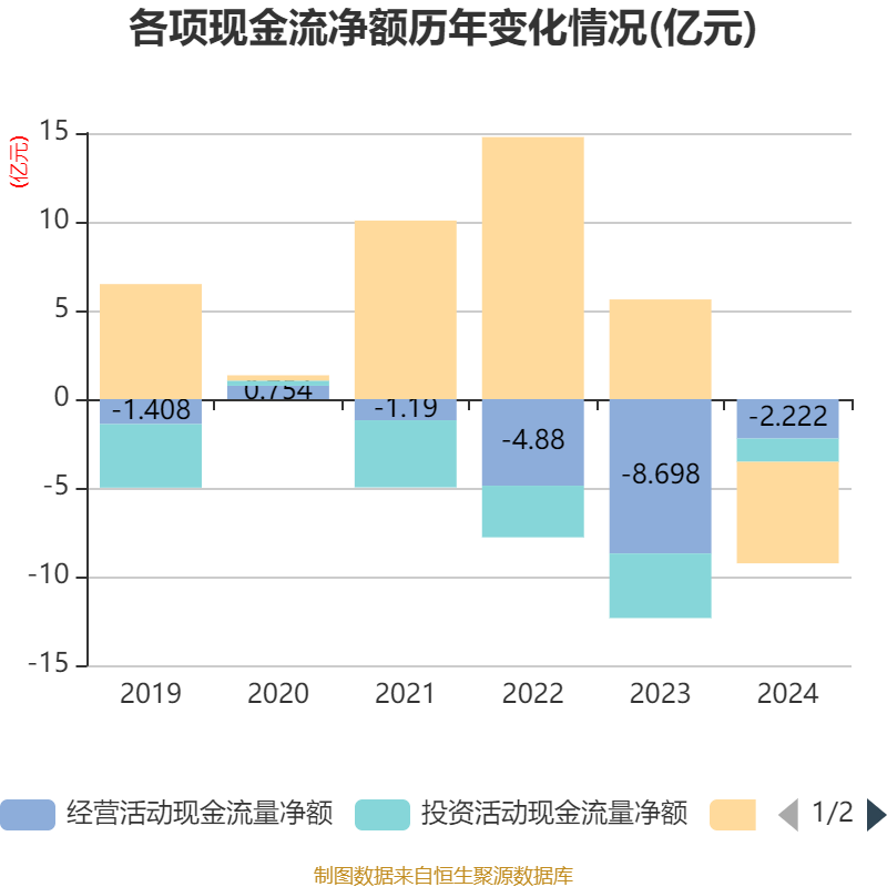截至2024年,公司经营活动现金流净额为-2.22亿元,同比增加6.48亿元;筹资活动现金流净额-5.72亿元,同比减少11.34亿元;投资活动现金流净额-1.31亿元,上年同期为-3.64亿元。