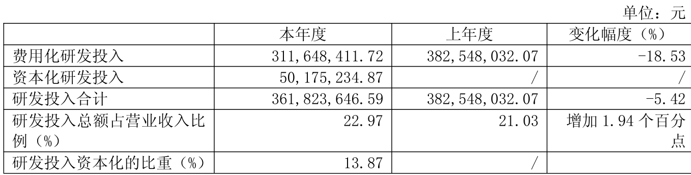 2024年全年,公司研发投入金额为3.62亿元,同比下降5.42%;研发投入占营业收入比例为22.97%,相比上年同期上升1.94个百分点。此外,公司全年研发投入资本化率为13.87%。