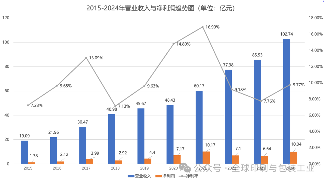 细分产品营收结构显示,日用消费系列是公司的第一大收入来源,2024年实现营收48.33亿元,占总营收的47.05%,毛利率为16.5%,销量约56.47万吨。食品与医疗包装材料系列紧随其后,营收18.59亿元,占比18.09%,毛利率10.28%,销量约24.98万吨。烟草行业配套系列虽然营收规模(9.07亿元,占比8.83%)相对较小,但其毛利率高达22.81%,盈利能力突出。